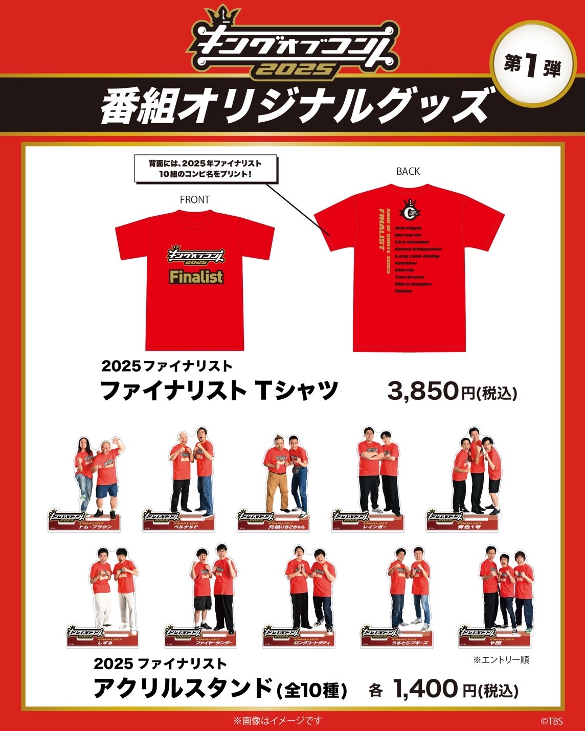 ファイナリスト10組のアクリルスタンドや、背面に今大会のファイナリストの名前がプリントされたファイナリスト Tシャツを販売します。